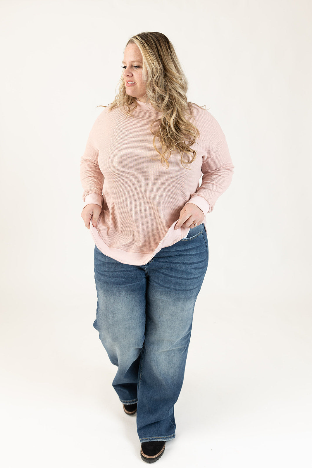 Waffle knit pullover top in dusty pink. Curved hem with side slits. Hem, cuffs, and crew neck in a contrasting ribbed knit fabric. Perfect everyday wear, layer it up or wear it solo a comfortable piece you'll reach for daily.