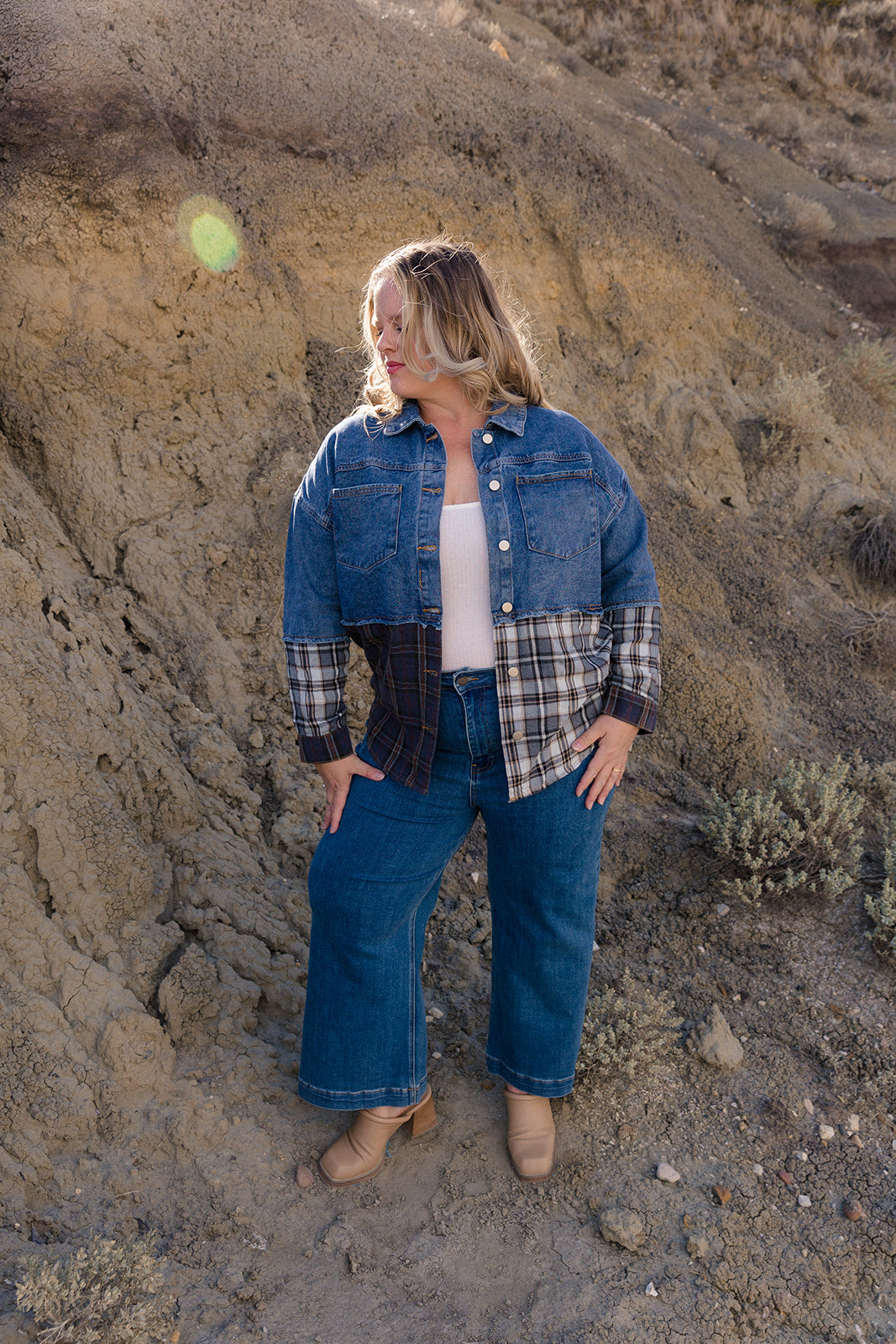 Toni Denim & Plaid Check Button Down Shacket Curvy