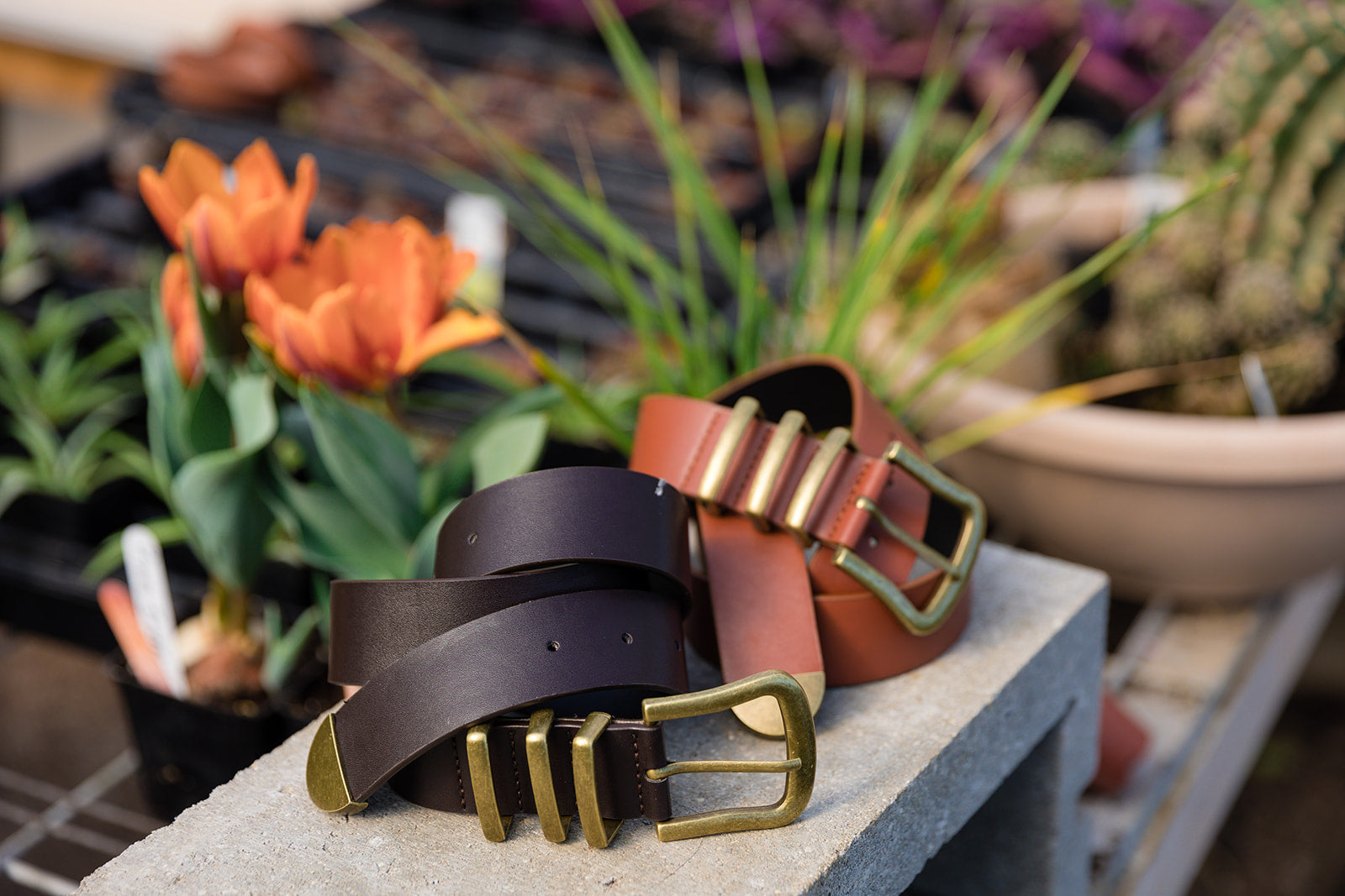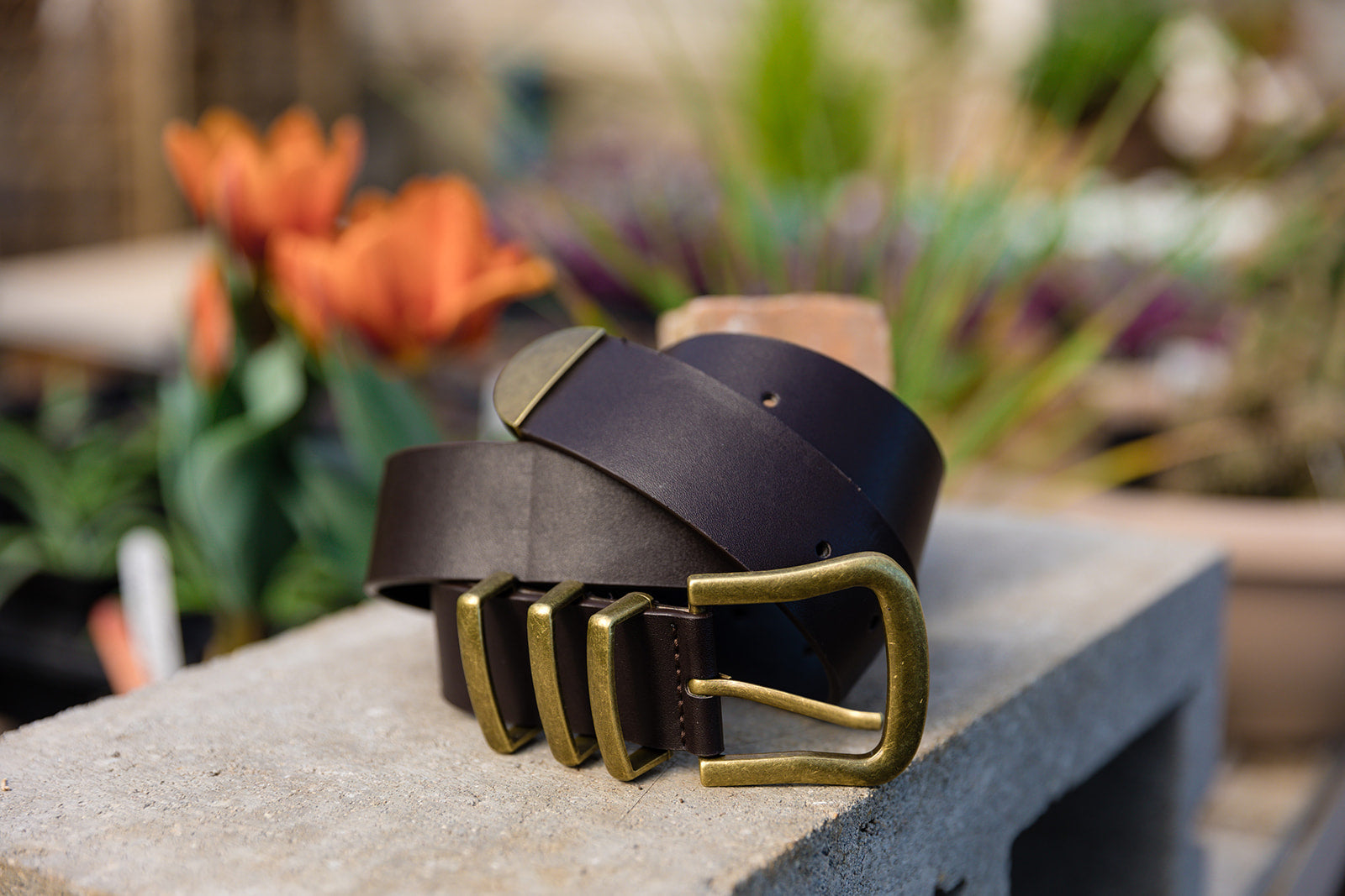 100% vegan leather belt in black or camel with brushed bronze belt buckle, 3 brushed bronze loops, and a brushed bronze tongue.
