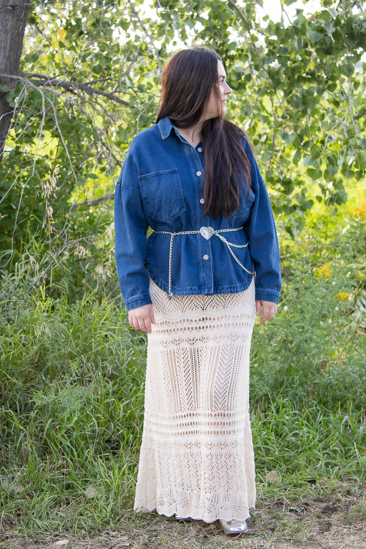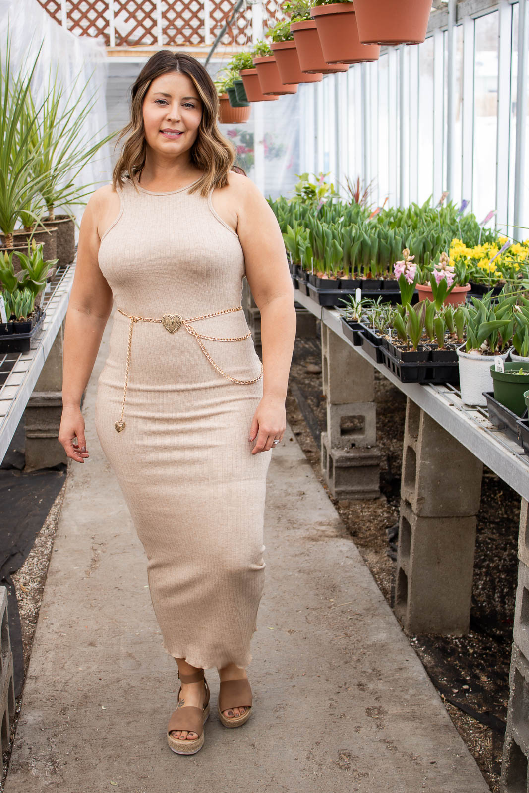 Skinny Chain link belt with a 2" heart near the clasp closure, a 1" dangling heart at the tip, and two fan-style drop chains at the left hip, 44 inches long, and about .25 inches wide. In gold and silver.
