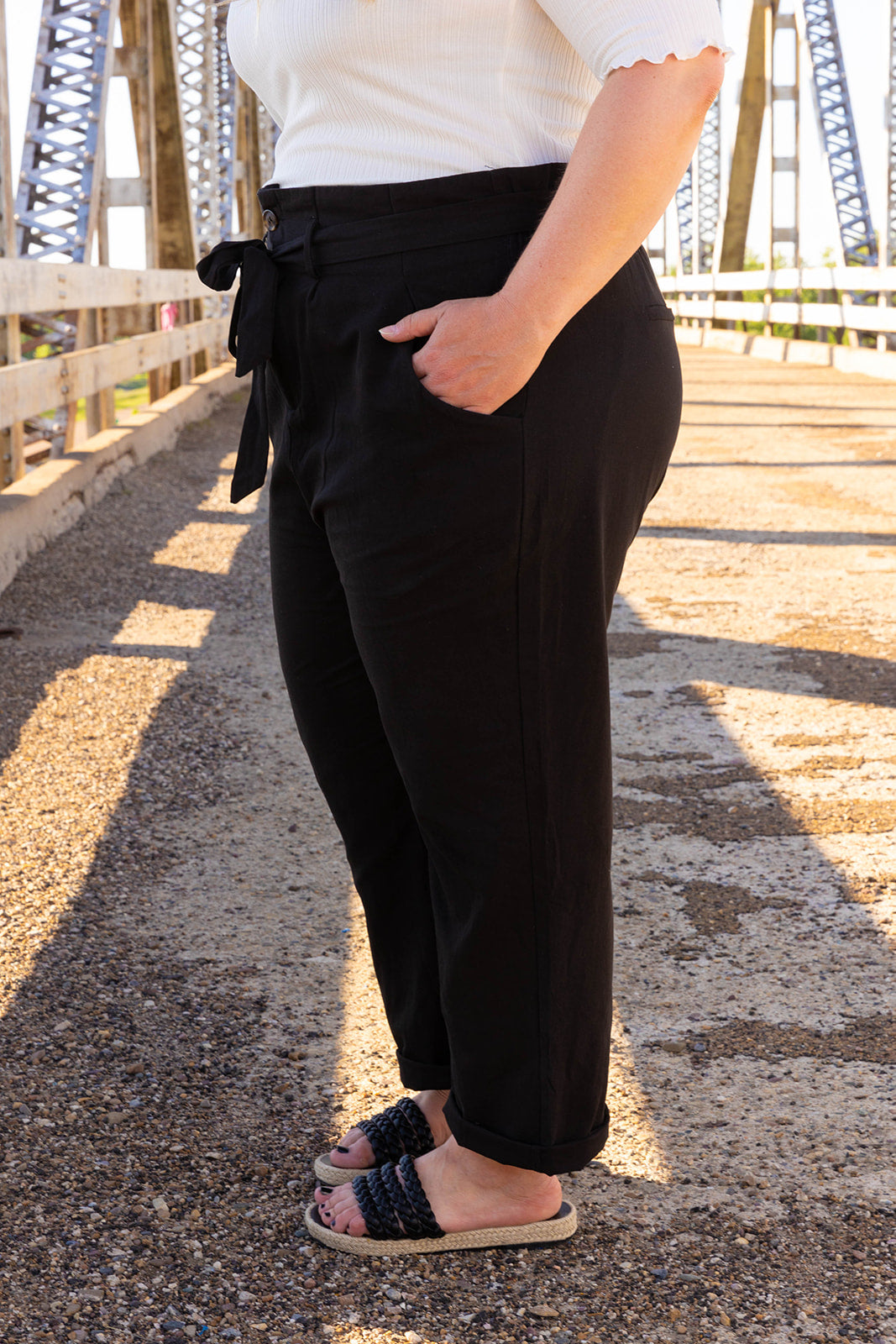 Pleated Paperbag waist pant in black, with matching fabric tie belt and side slit pockets.