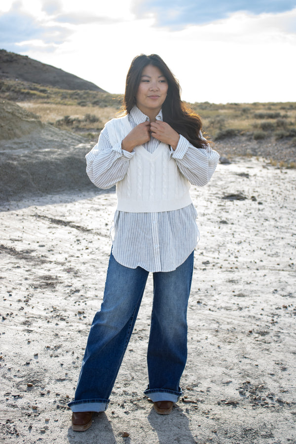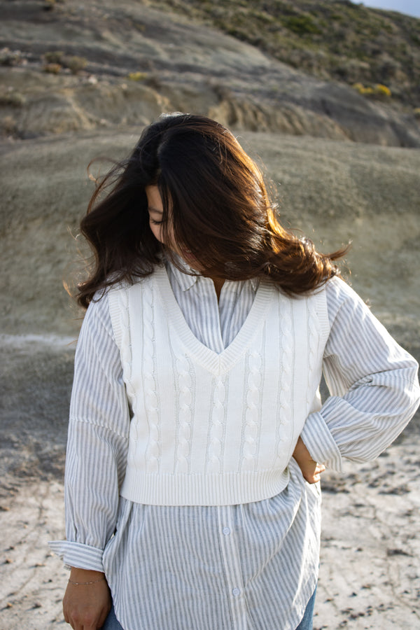 The sweater vest revival you didn’t know you needed. This white cropped knit features classic cable detailing and a deep V-neck cut that layers perfectly over button-downs, turtlenecks, or even a simple tee. A modern take on vintage prep that...