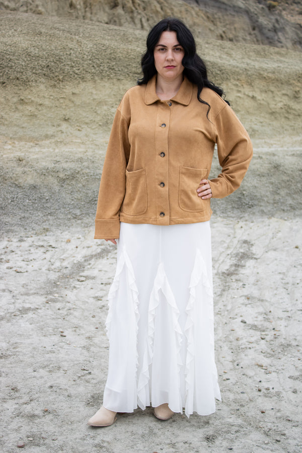 Meet your new favorite statement skirt. The Mercedes Maxi Ruffle Skirt is a stunning ruffle skirt in white, with a flared hem, fully lined, wide elastic waistband, and inverted V-shaped ruffles front and back. The shape flatters every figure and...