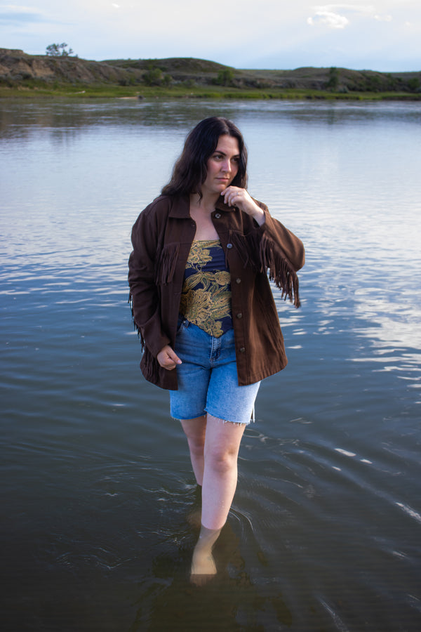 Effortlessly stylish and made for adventure, the Santa Fe Espresso Western Fringe Jacket is a must-have for boho and western-inspired wardrobes. Crafted from 100% breathable cotton, this lightweight jacket features bold fringe detailing, a rich espresso hue, and a relaxed...